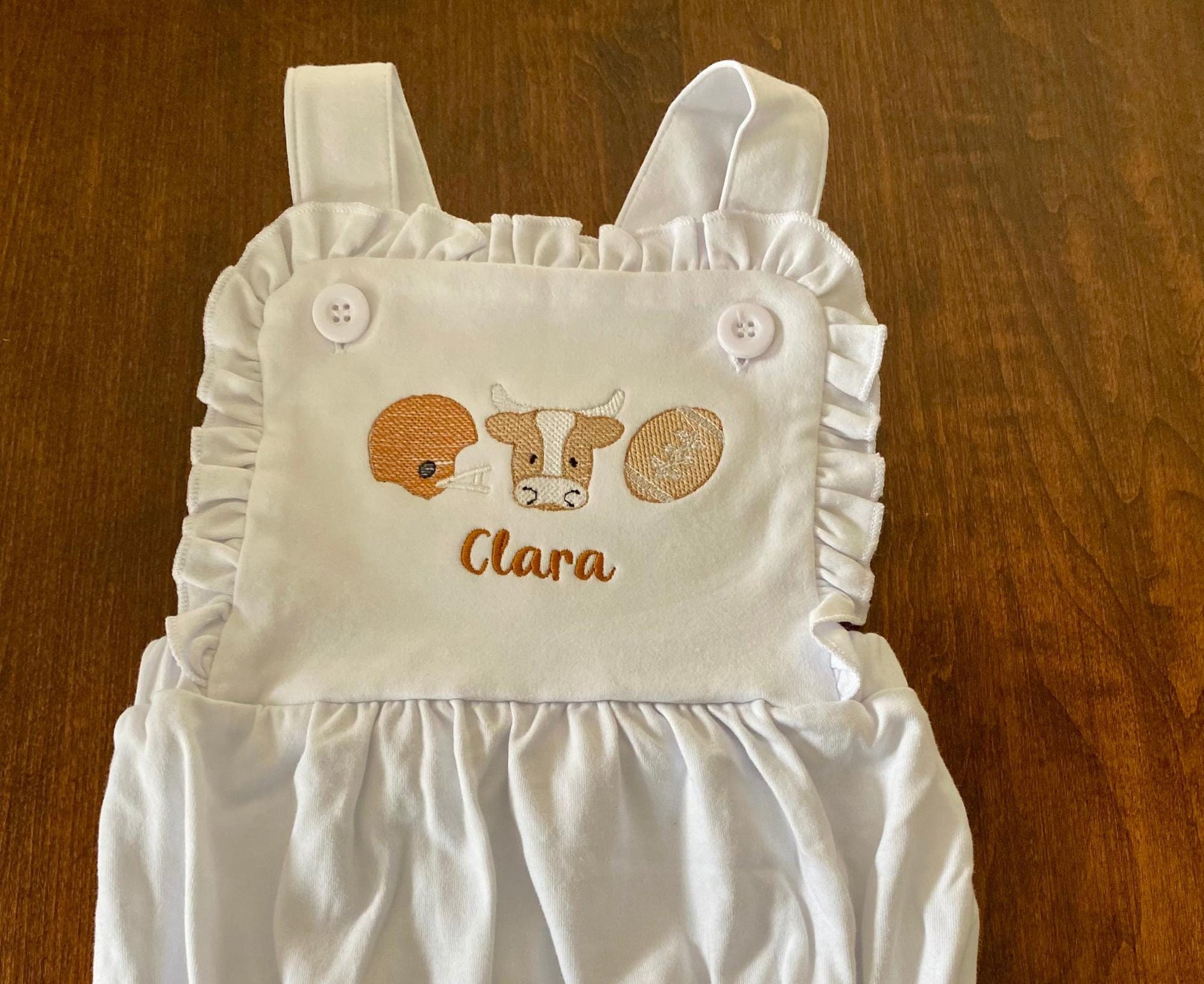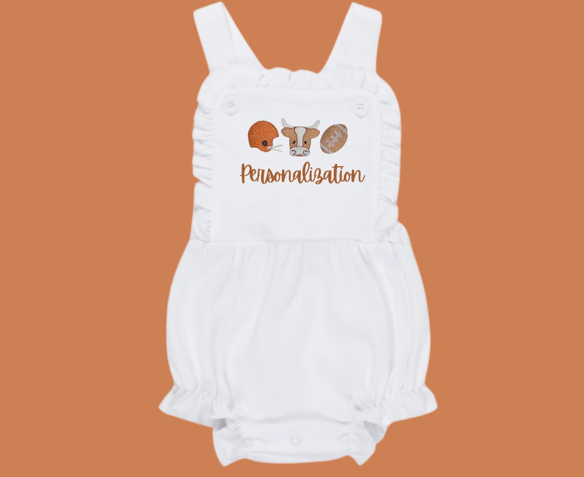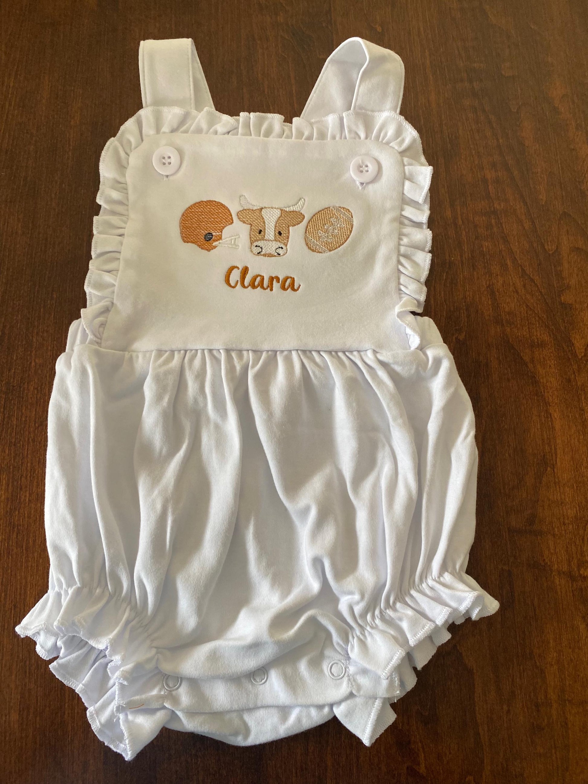 Adorable longhorn embroidered sunsuit perfect for little Texas fans! Made from soft cotton, ideal for warm weather.