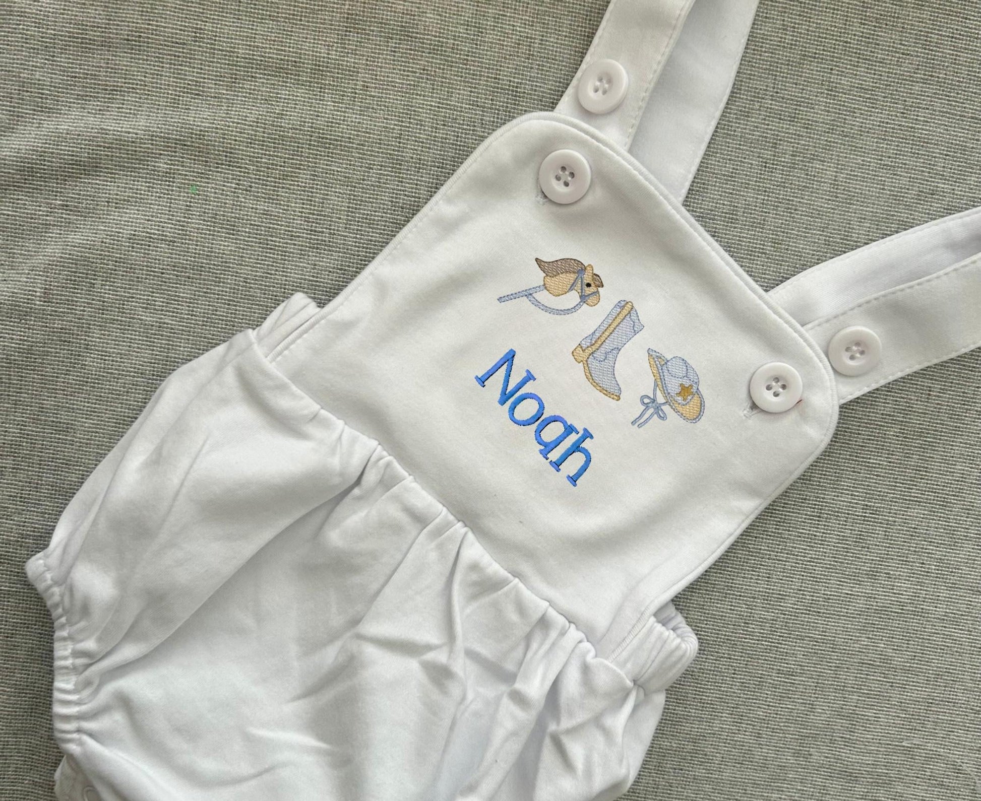 Adorable "My 1st Rodeo" cowboy boots embroidered sunsuit perfect for your little cowboy! Made from soft cotton, ideal for warm weather and birthday celebrations.