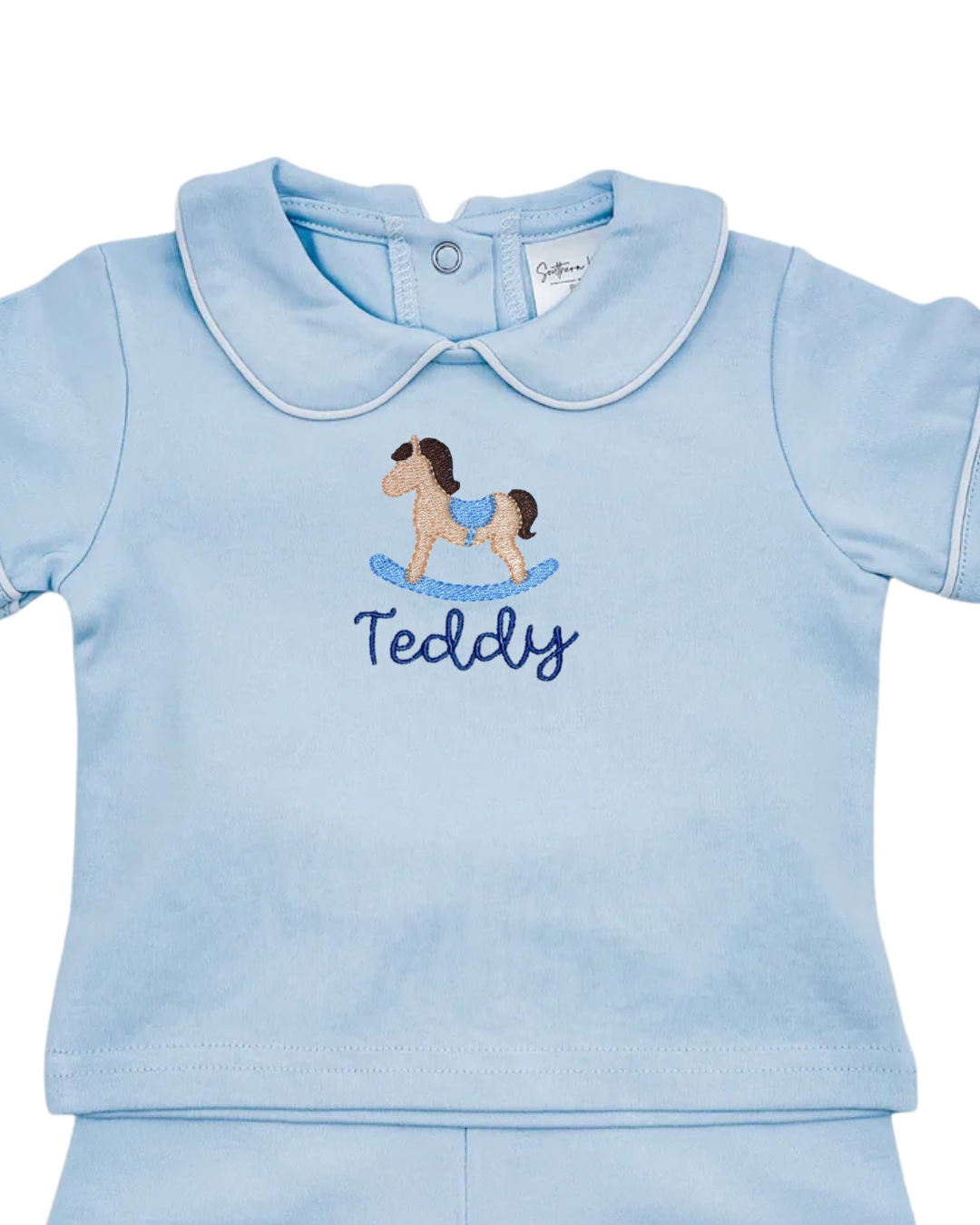 This light blue two-piece short set features a Peter Pan collar top paired with coordinating elastic waist shorts. The embroidered rocking horse adds a traditional nursery-inspired touch that feels timeless and elevated.