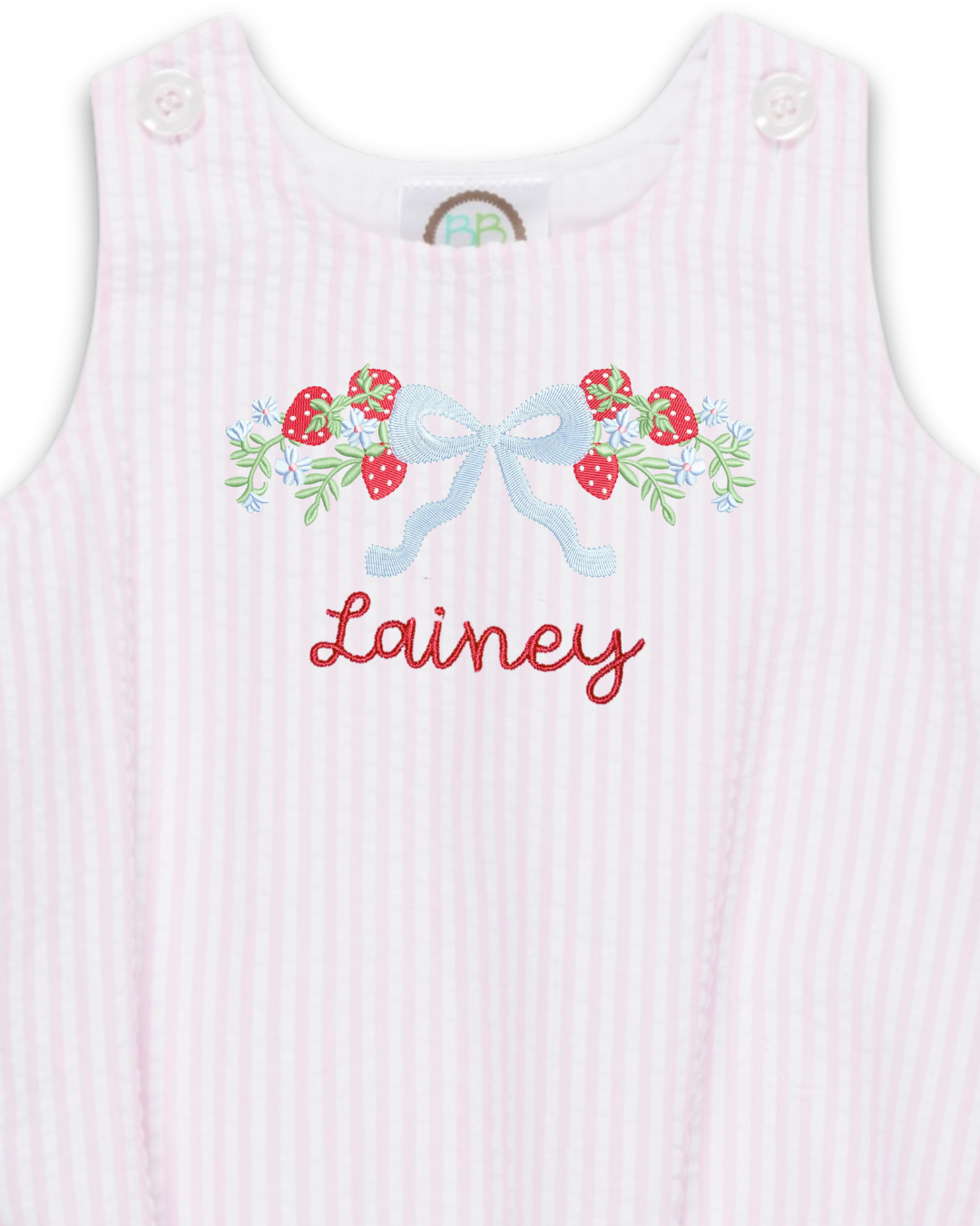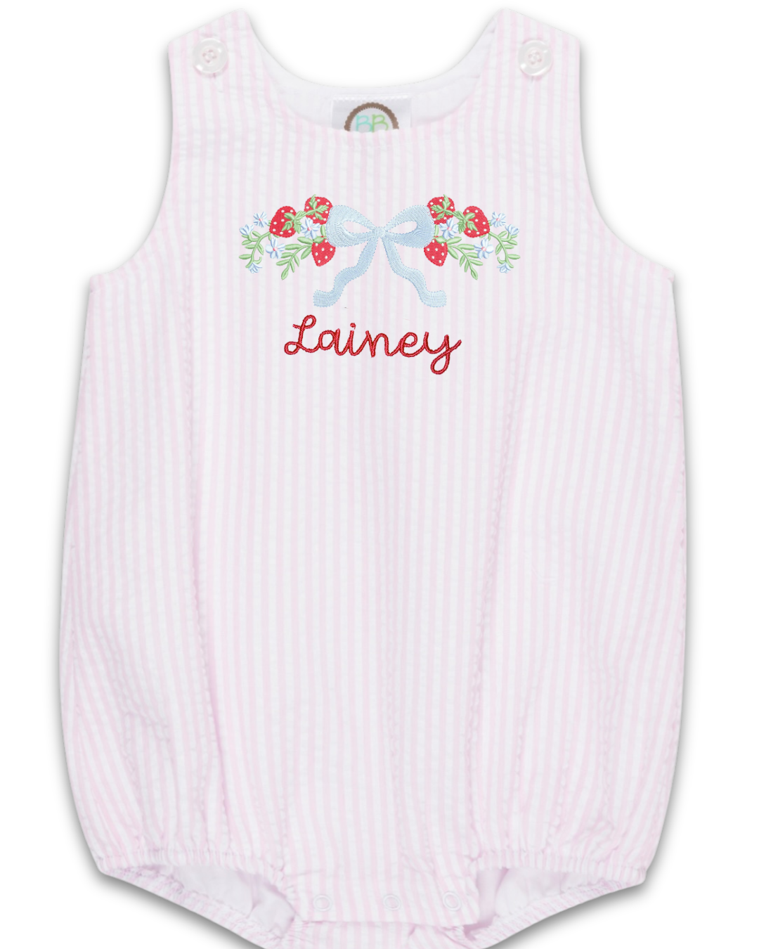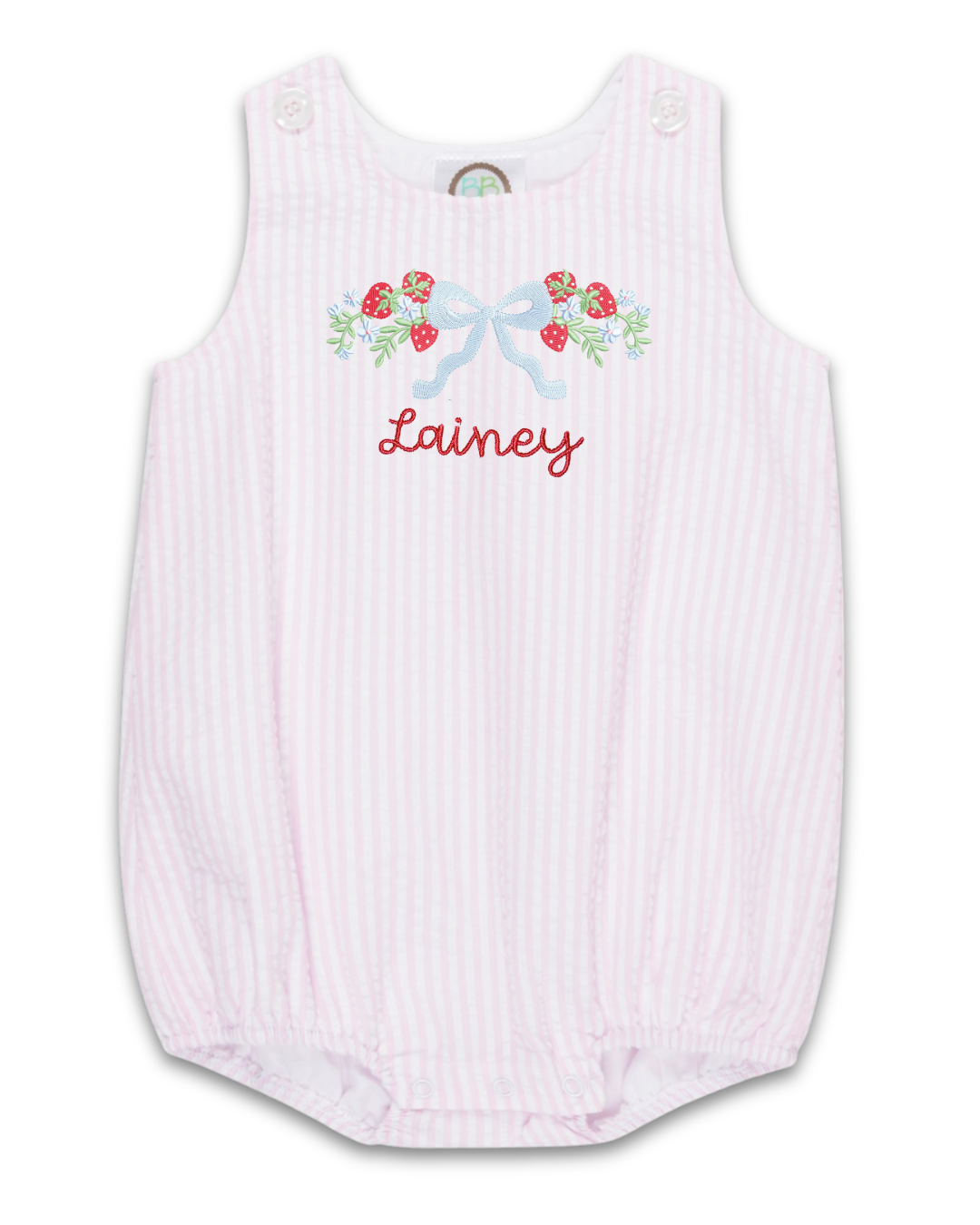 A sweet summer bubble featuring embroidered strawberries and a soft blue bow detail.